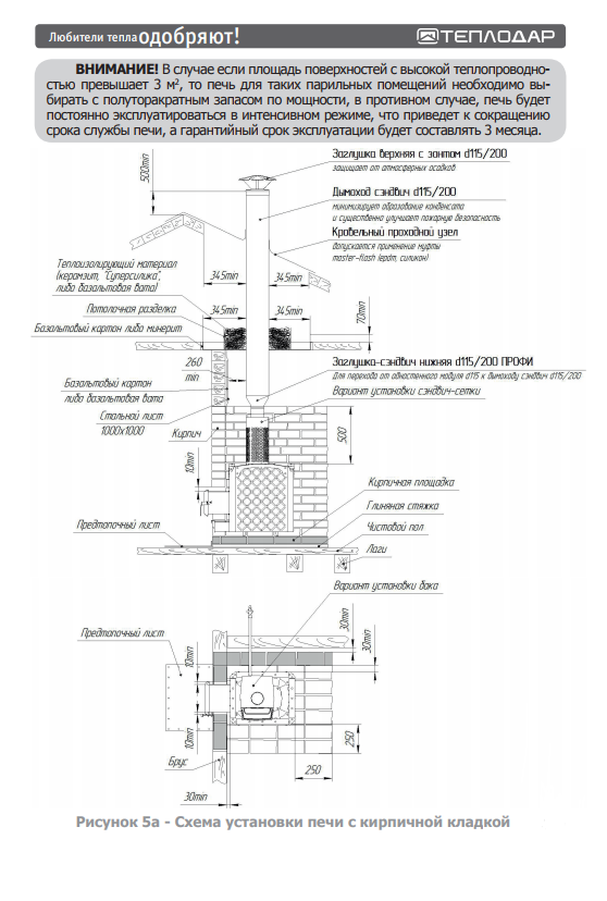 Еще одной отличительной особенностью печи, без сомнений, стала максимально возможная площадь теплообмена за счет большого количества ребер чугунной топки. Да и округлая форма самой топки сконструирована так, чтобы прогревать весь объем каменной закладки без застойных «холодных» зон. В результате имеем максимально жесткую и действительно прочную печь. На печь можно установить любые стандартные элементы дымохода. Гарантийный срок — 5 лет!